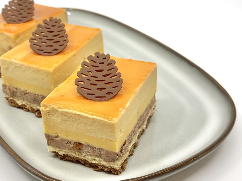 Gemaakt met choco bavarosie, luchtige caramel anglaise en sinaasappel cremeux.