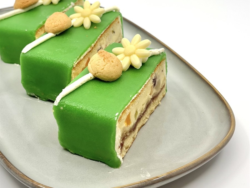 Een klassiek gebakje bestaande uit luchtige cake met room, fruit, bitterkoekjes en een laagje marsepein.