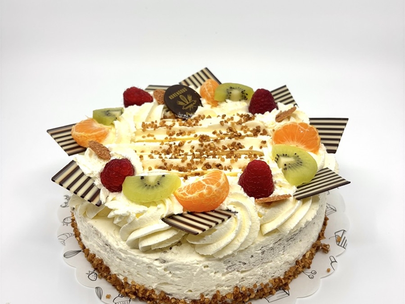 Onze verrukkelijke slagroomtaart gemaakt met luchtige cake, volle slagroom, rode vruchten compote.. Hij wordt gedecoreerd met fruit en chocolade.